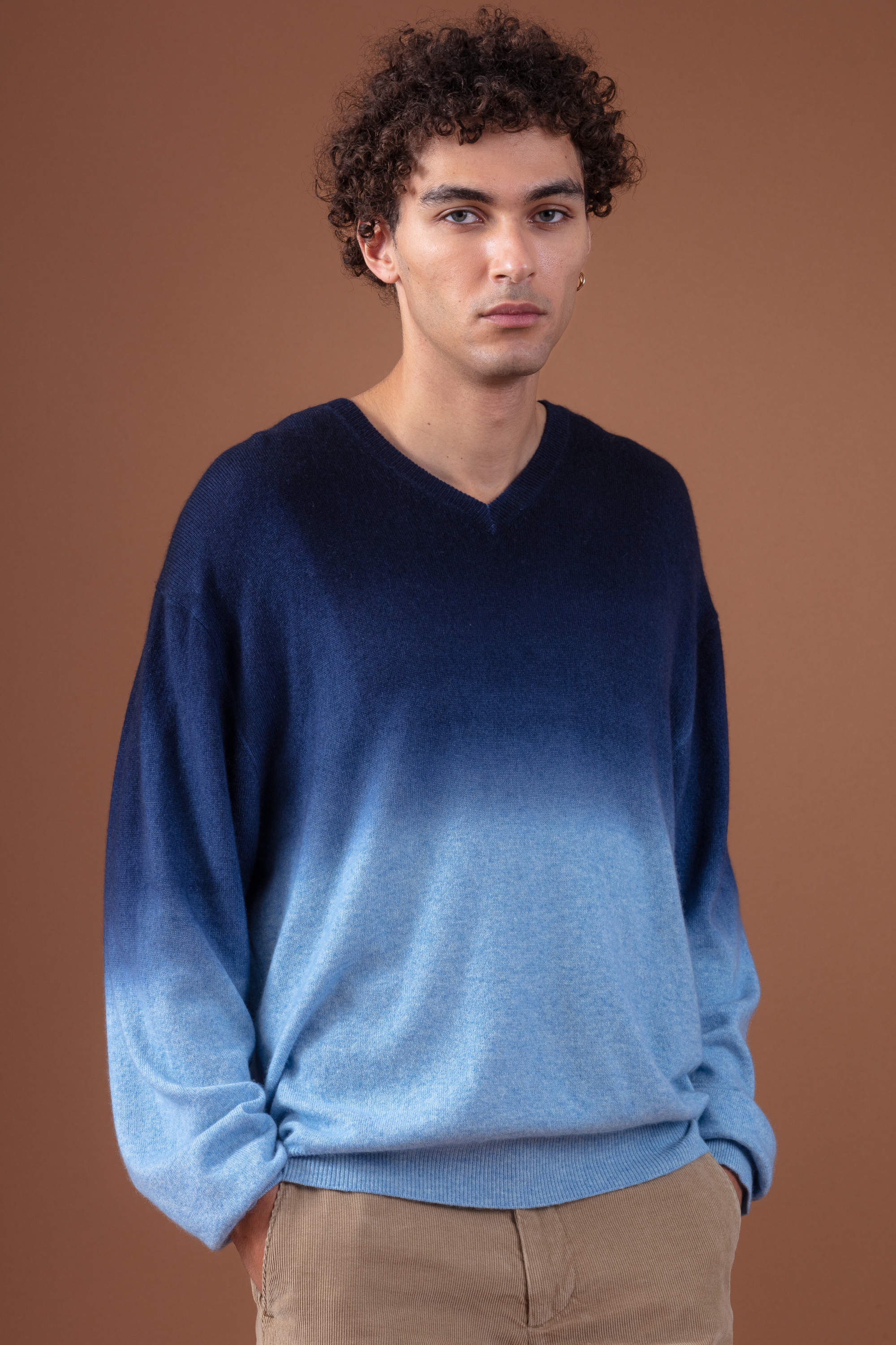 Pull col V avec print degradé esprit tie & dye. Un cachemire tendance à porter sans modération ! Découvrez nos versions de couleurs imaginées avec soin pour vous proposer des modèles originaux mais faciles à porter.