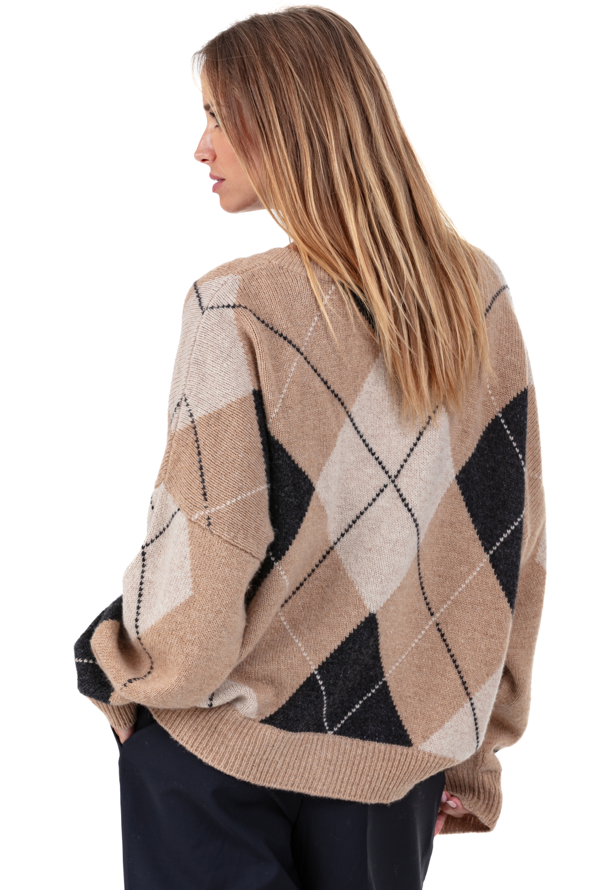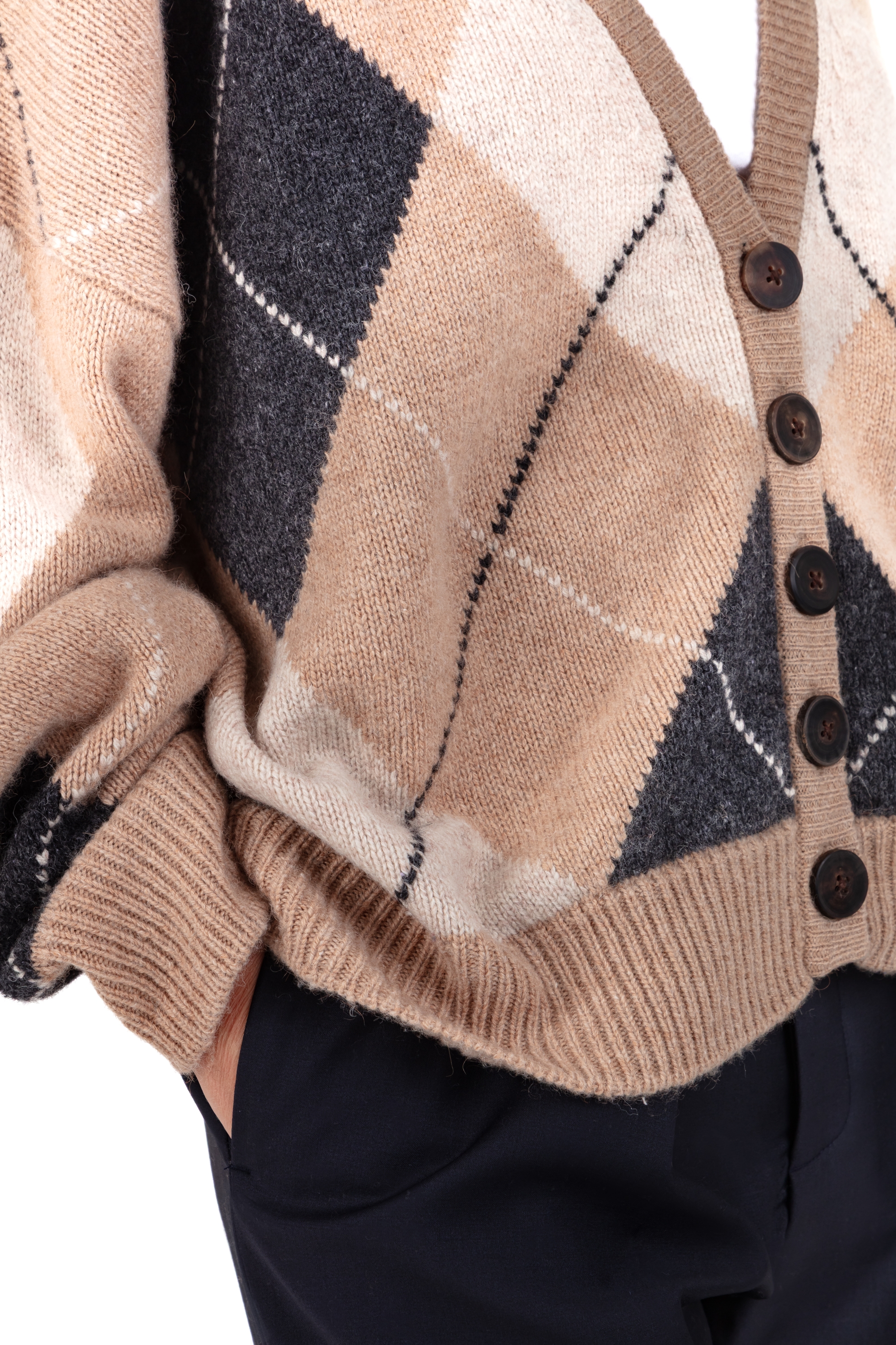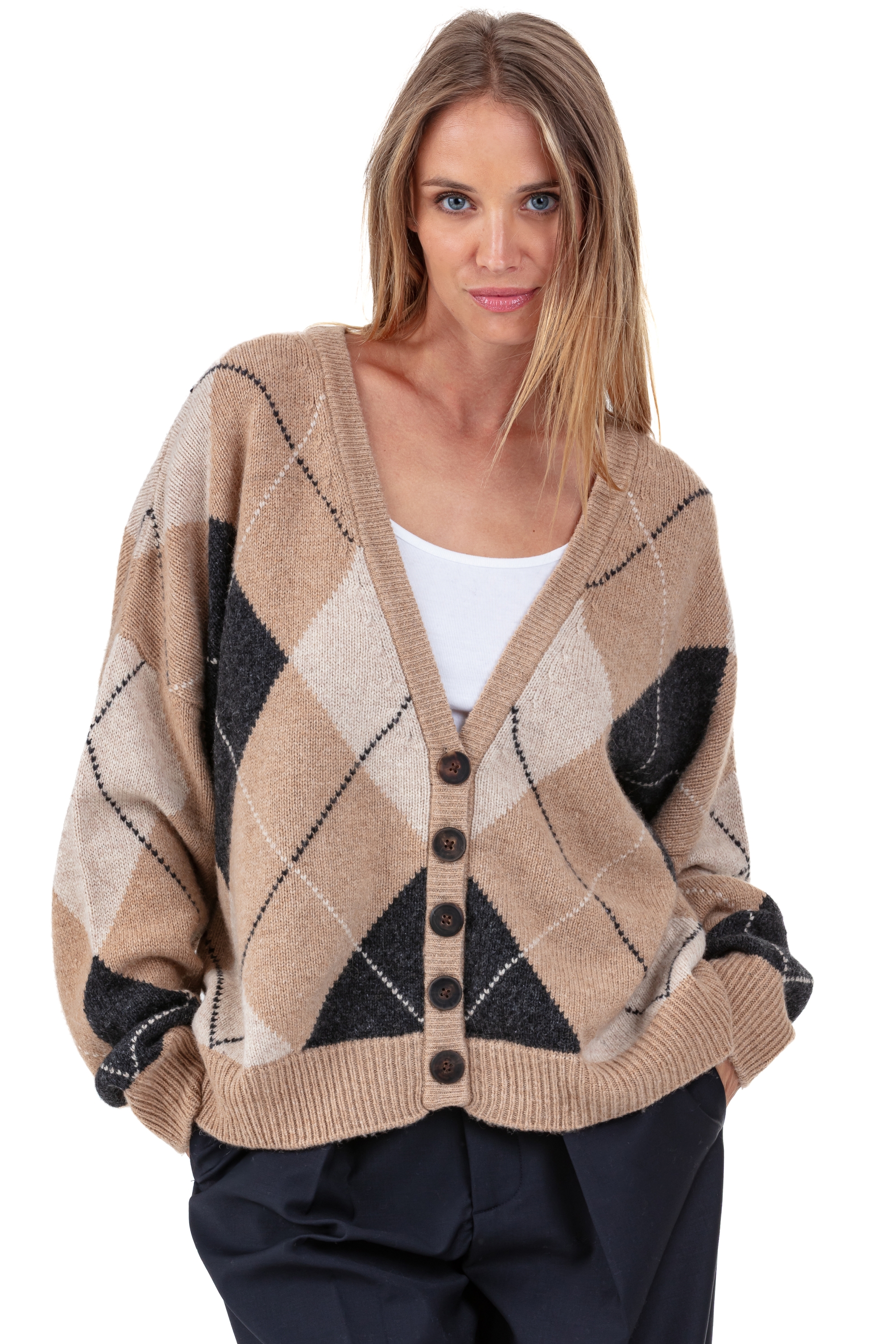 Original et plein de caractère, le cardigan femme PANDORE en laine de chameau séduit par son allure rétro et son effet vintage tricolore. Tricoté en 100% chameau 2 fils, il se distingue par son motif à carreaux travaillé et sa coupe ample. Son col V, sa patte boutonnée et ses manches longues en font une pièce facile à porter et à superposer, tout en restant graphique et moderne.
