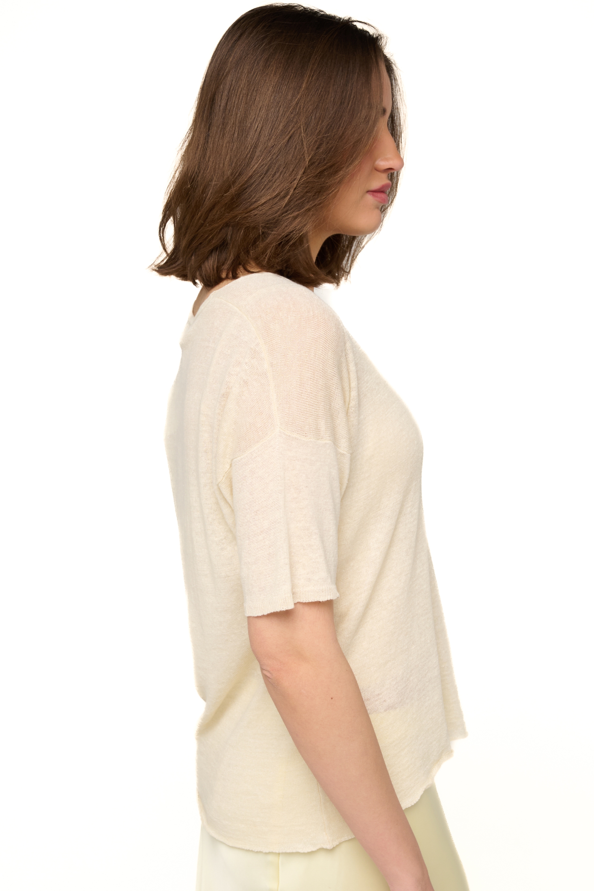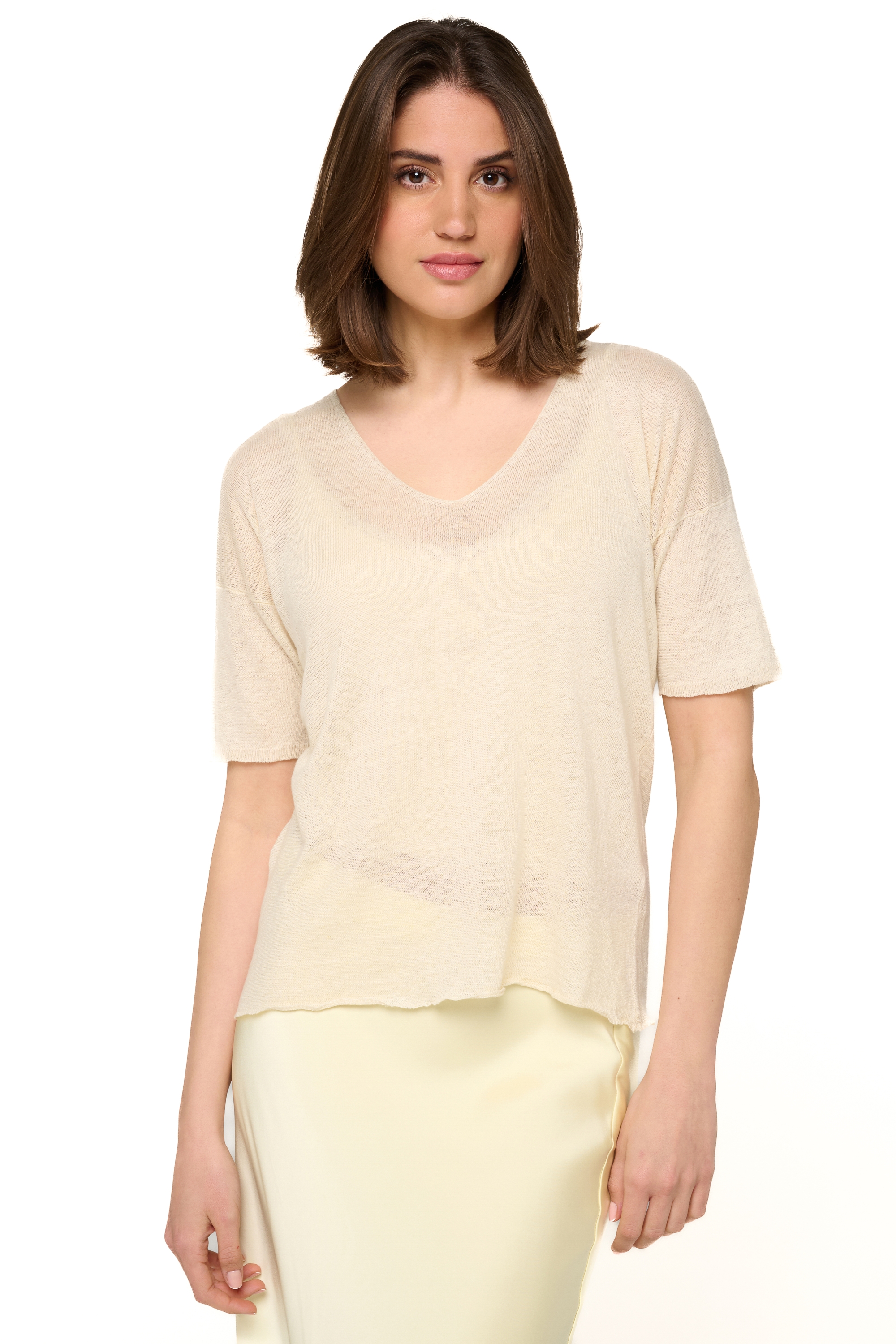 T-shirt à encolure V tricoté en lin. Un indispensable pour les beaux jours. Son tombé légèrement lo... En savoir plus