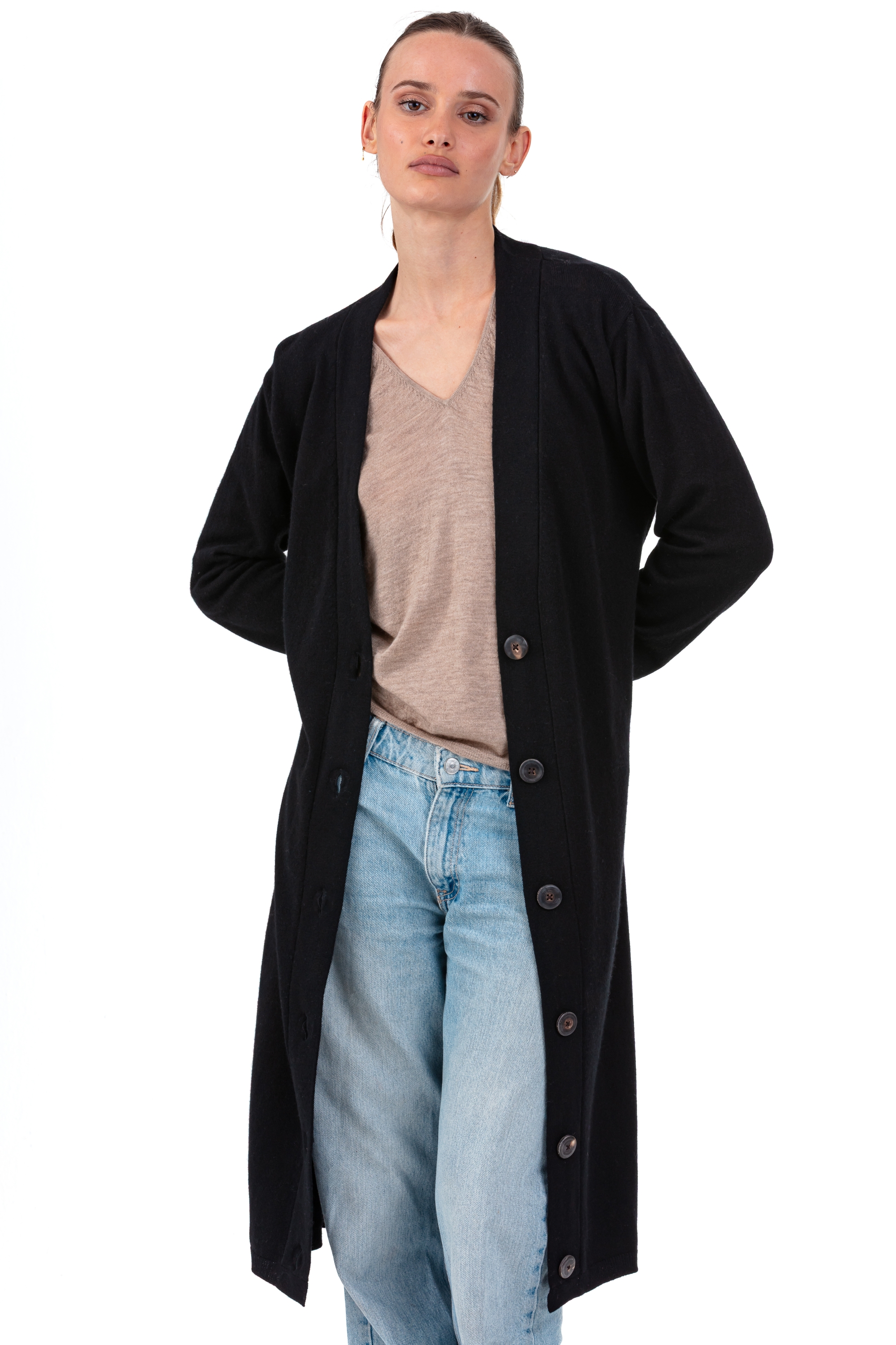 Avec sa longueur généreuse et son design intemporel, le gilet RIMINI extra long est une pièce forte du vestiaire féminin. Tricoté en cachemire 2 fils, jauge 12, il séduit par sa coupe droite et ample, son col V profond et sa ligne élancée qui sublime toutes les silhouettes.