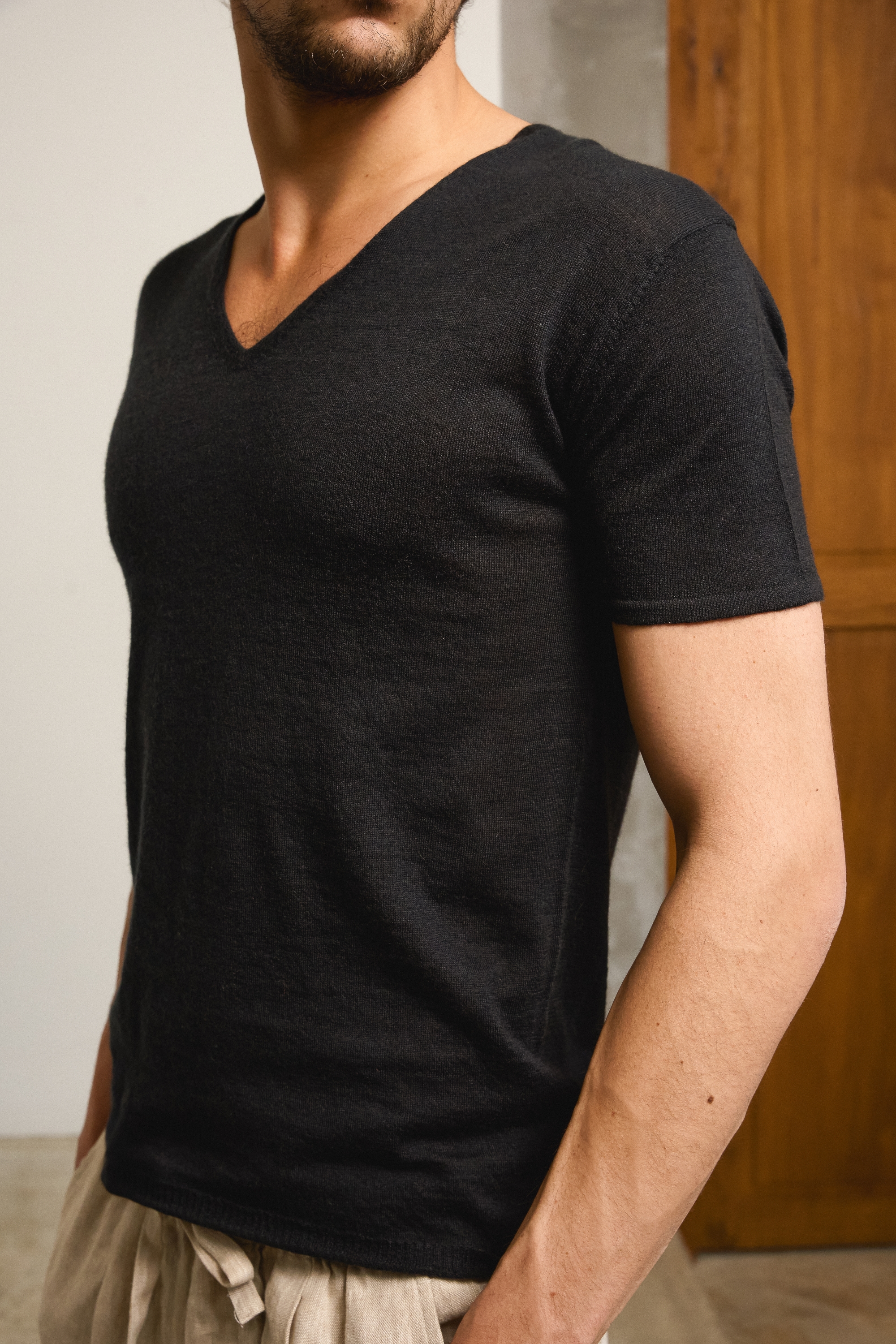 Col V manches courtes, avec finitions bords côtes en bas de pull de 2 cm et finitions bords tubulaires en bas de manches de 0,5 cm. Un peu fragile, légèrement transparent mais si sublime. A réserver aux connaisseurs.