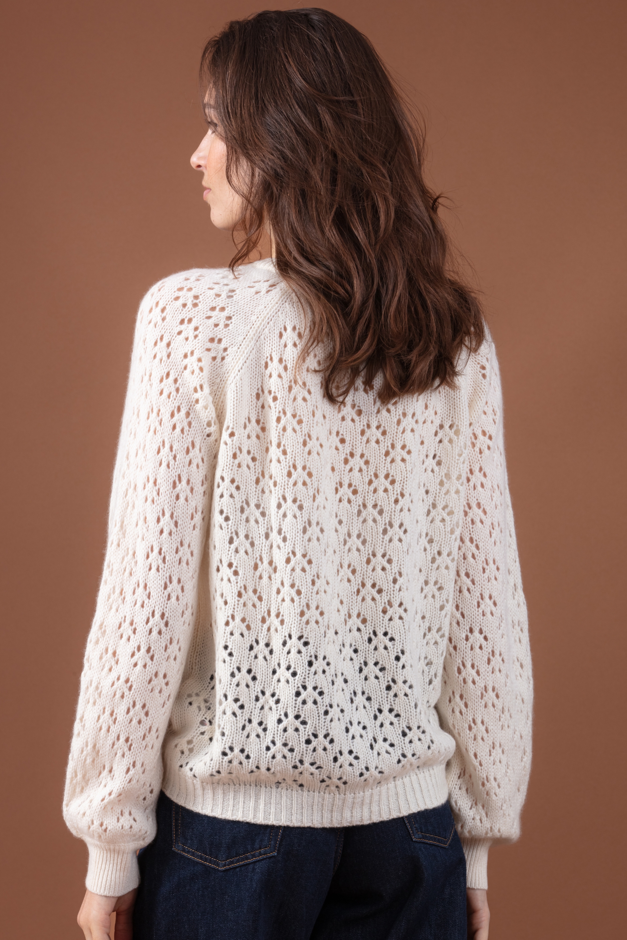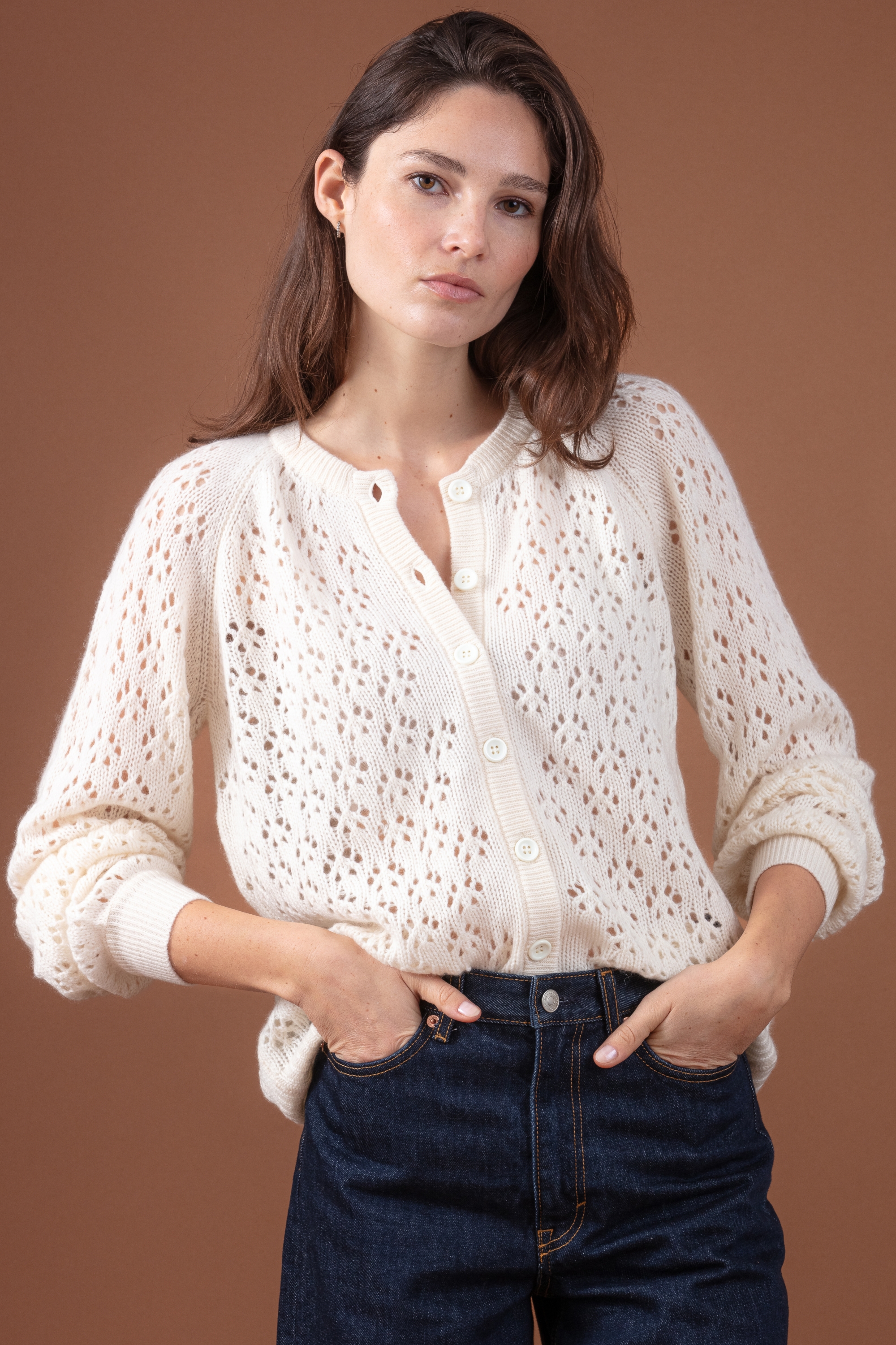 Délicatement travaillé, le gilet ROSABELLE séduit par son charme rétro et sa douceur enveloppante. Tricoté en 100% cachemire, il offre une chaleur réconfortante et une texture moelleuse. Aussi cocoon que tendance, c’est un modèle à porter toute l’année !
